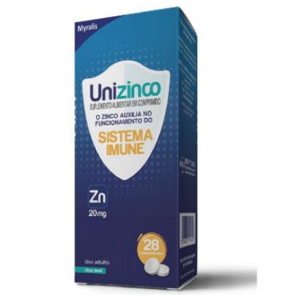 Unizinco 20mg c/ 28 Comprimidos - Unizinco contém 20 mg de zinco elementar, mineral reconhecido por contribuir para o fortalecimento do sistema imune, mantendo o sistema de defesa do corpo forte e eficiente e prevenindo o desenvolvimento de certas doenças.